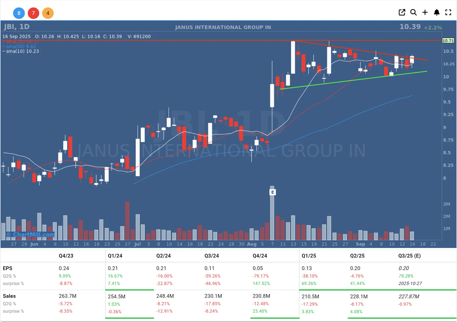 Plan: I see a classic volatility contraction pattern (à la Minervini). A breakout above $10.70 on volume is the signal to enter. Stop just below the last higher low (around $10) for a tight risk/reward.