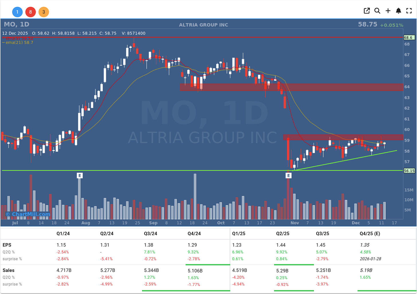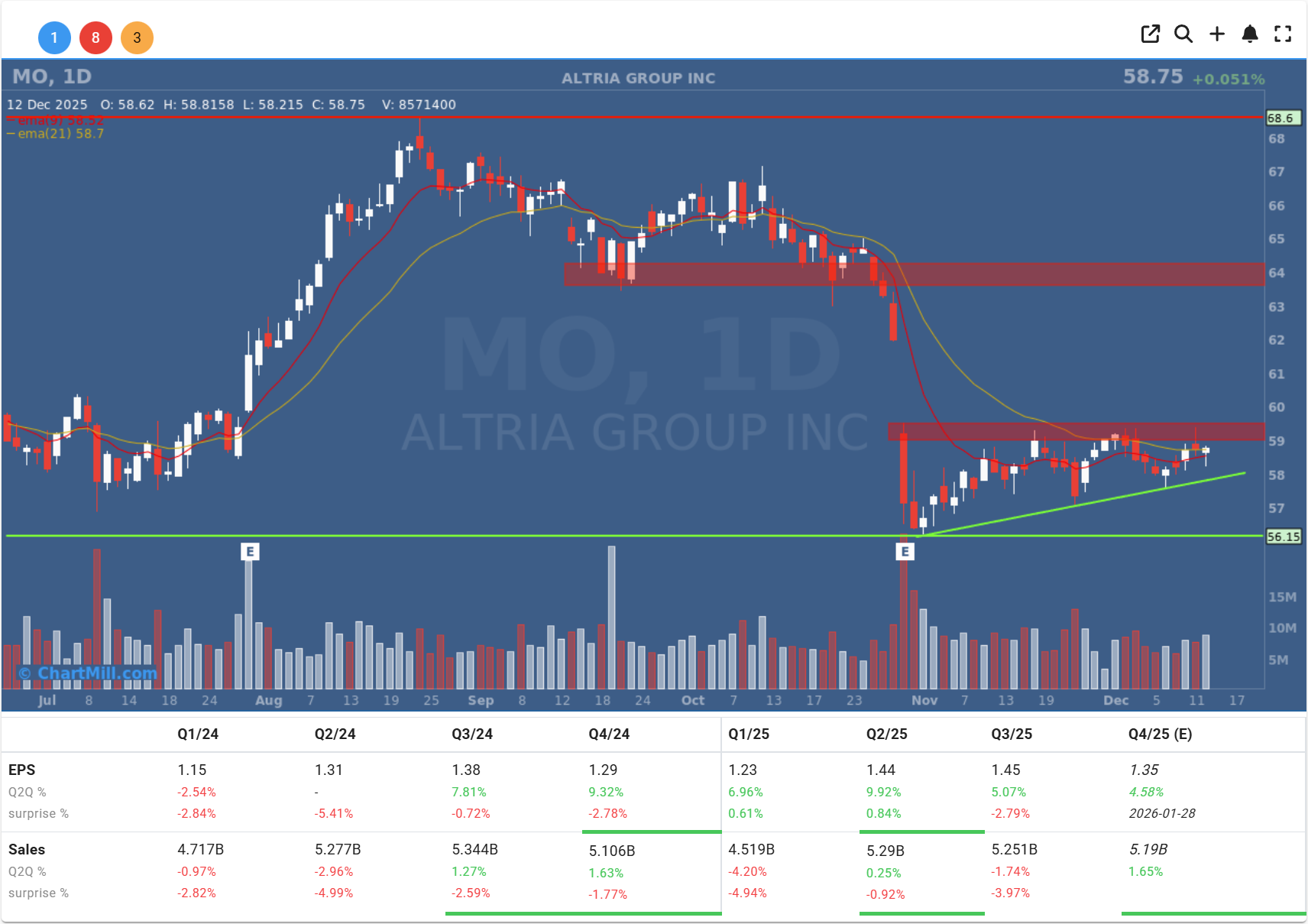 One potential ‘late mover’ in this context is Altria Group Inc. (NYSE: MO). While the stock has not yet staged a clear breakout, the price chart suggests an interesting technical setup that could benefit from continued sector momentum.