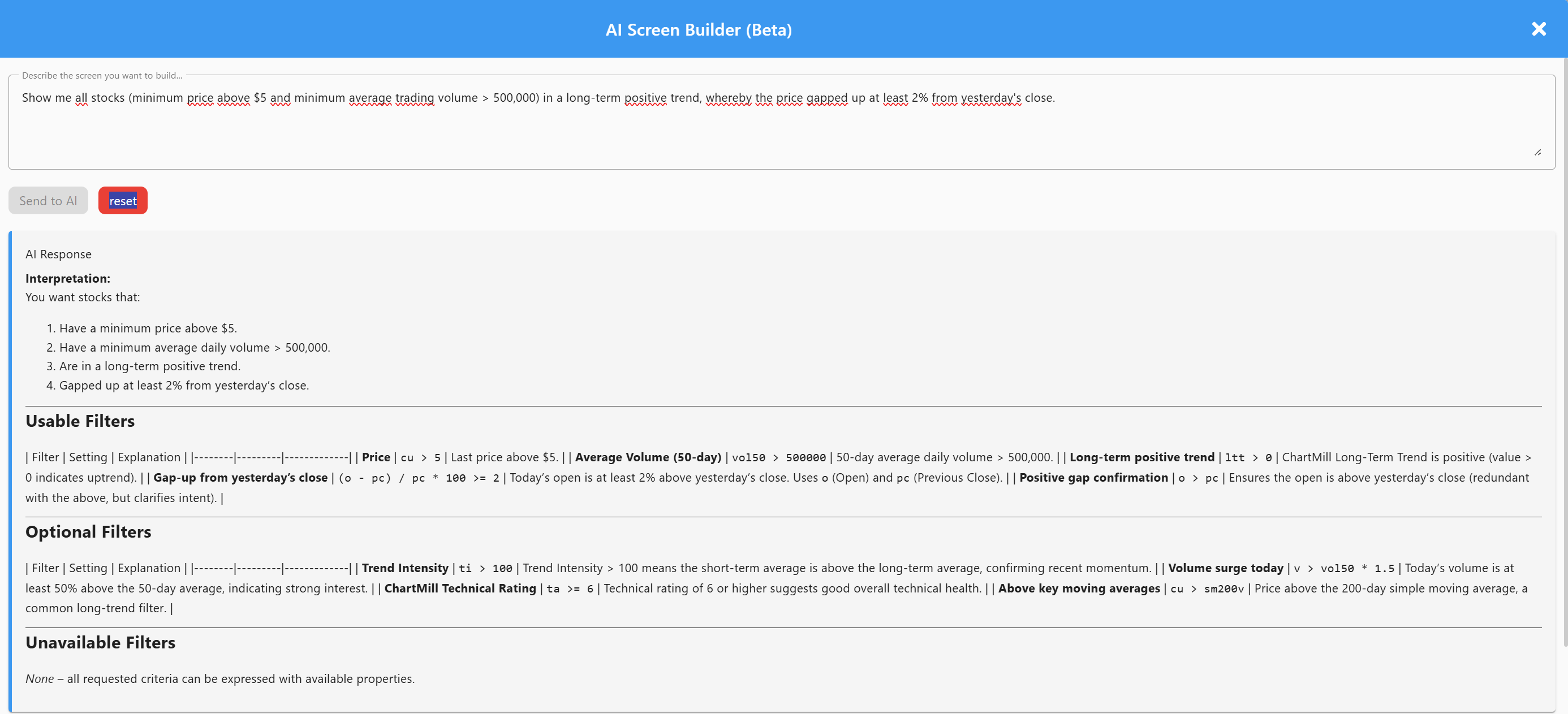 For seasoned ChartMill power users, your favorite filters and sliders aren’t going anywhere. The AI Screening Builder is a complementary tool designed to flatten the learning curve for new users and save time for pros.