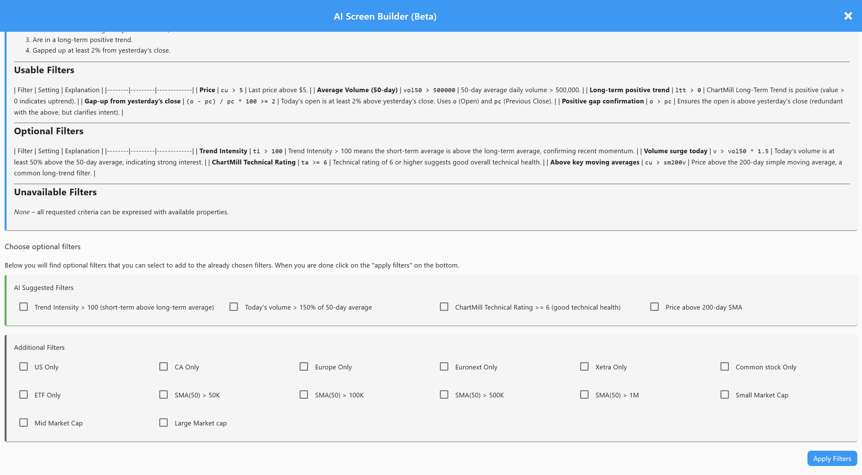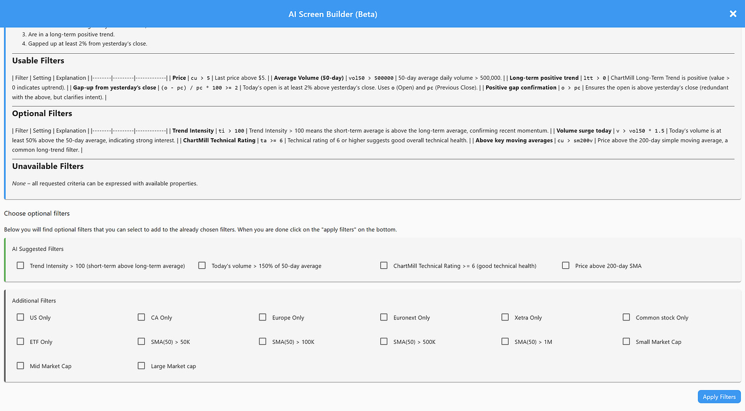 The real advantage is that you can see the AI’s reasoning process. ChartMill shows you exactly which filters are being triggered and suggests optional additions you might not have considered yourself.