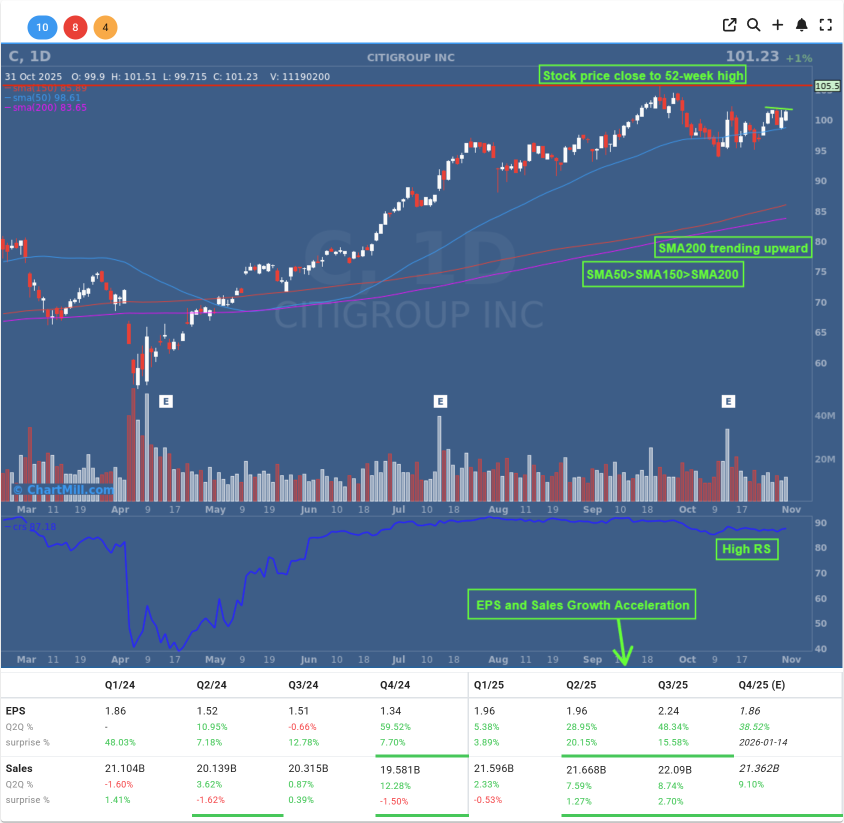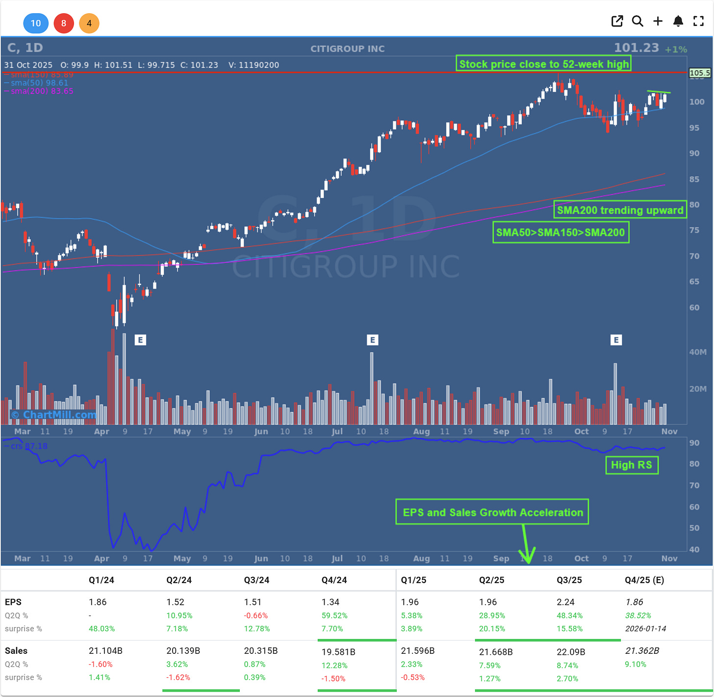This article is for educational and informational purposes only. It reflects a personal interpretation of a Mark Minervini-style cheat entry setup and is not financial advice or a recommendation to buy, sell, or hold any security, including Citigroup (C).