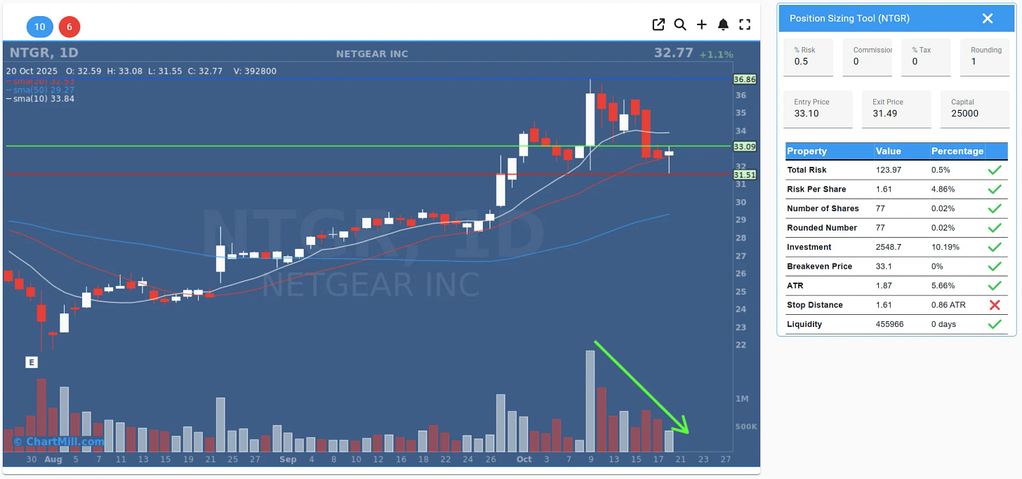 NTGR recently went through a strong breakout phase, pushing above the 33–34 zone with excellent volume in late September and early October. Since then, price has pulled back toward the rising 20-day SMA, creating a potential entry zone for swing traders.