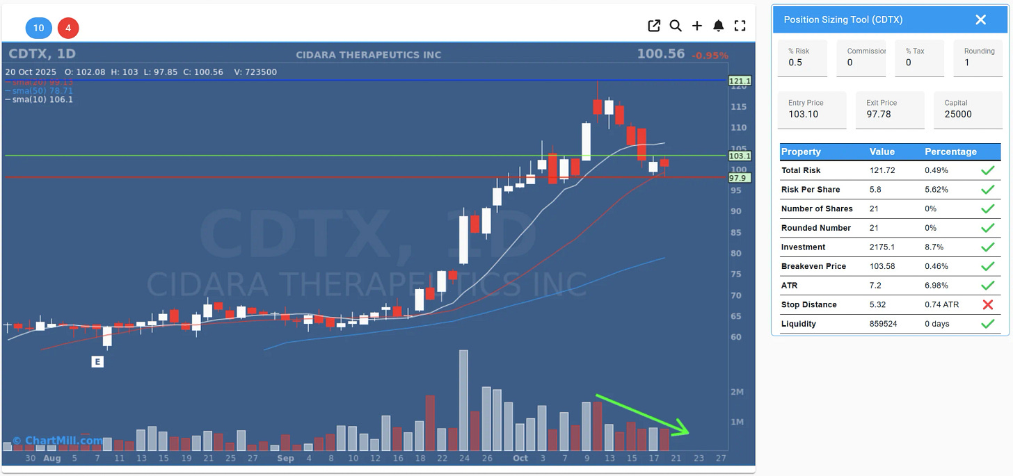 CDTX > Setup triggered (october 21) and stopped out next trading day (-0.5% on equity)