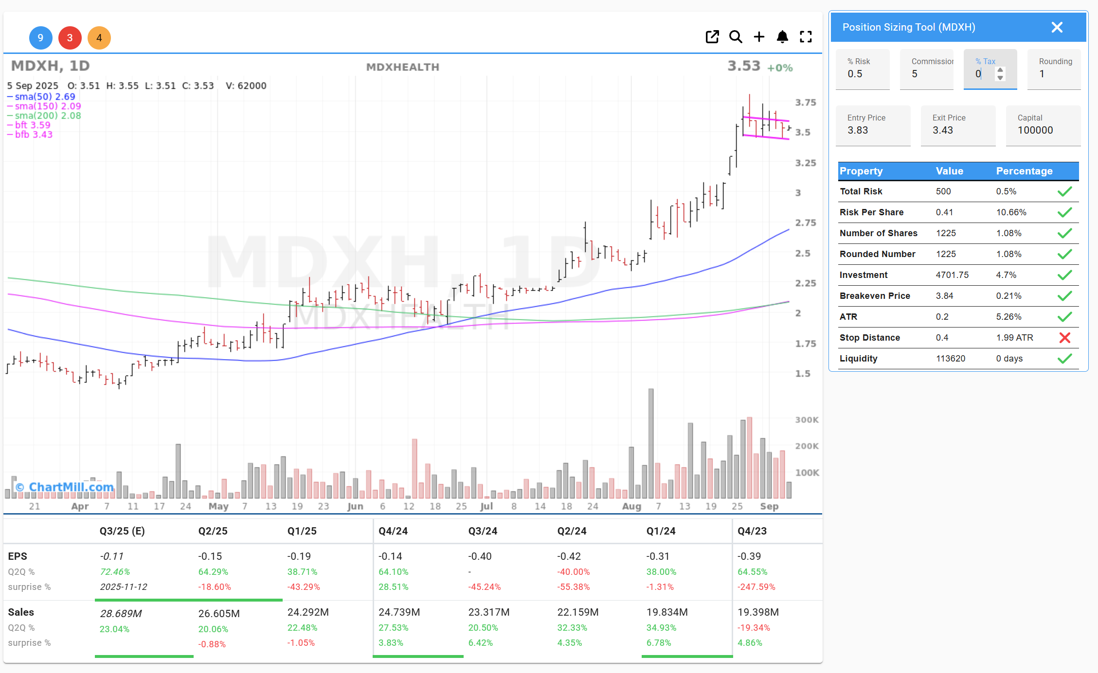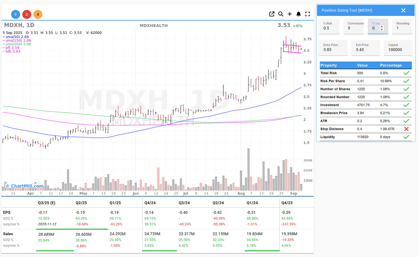 MDXH’s recent quarterly results show positive revenue trends. Sales have grown consistently across the last five quarters, with year-over-year increases ranging from 20% to 34%. EPS remains negative but has shown signs of gradual improvement. For swing traders, this steady revenue growth provides a fundamental backdrop that aligns well with the bullish chart setup.