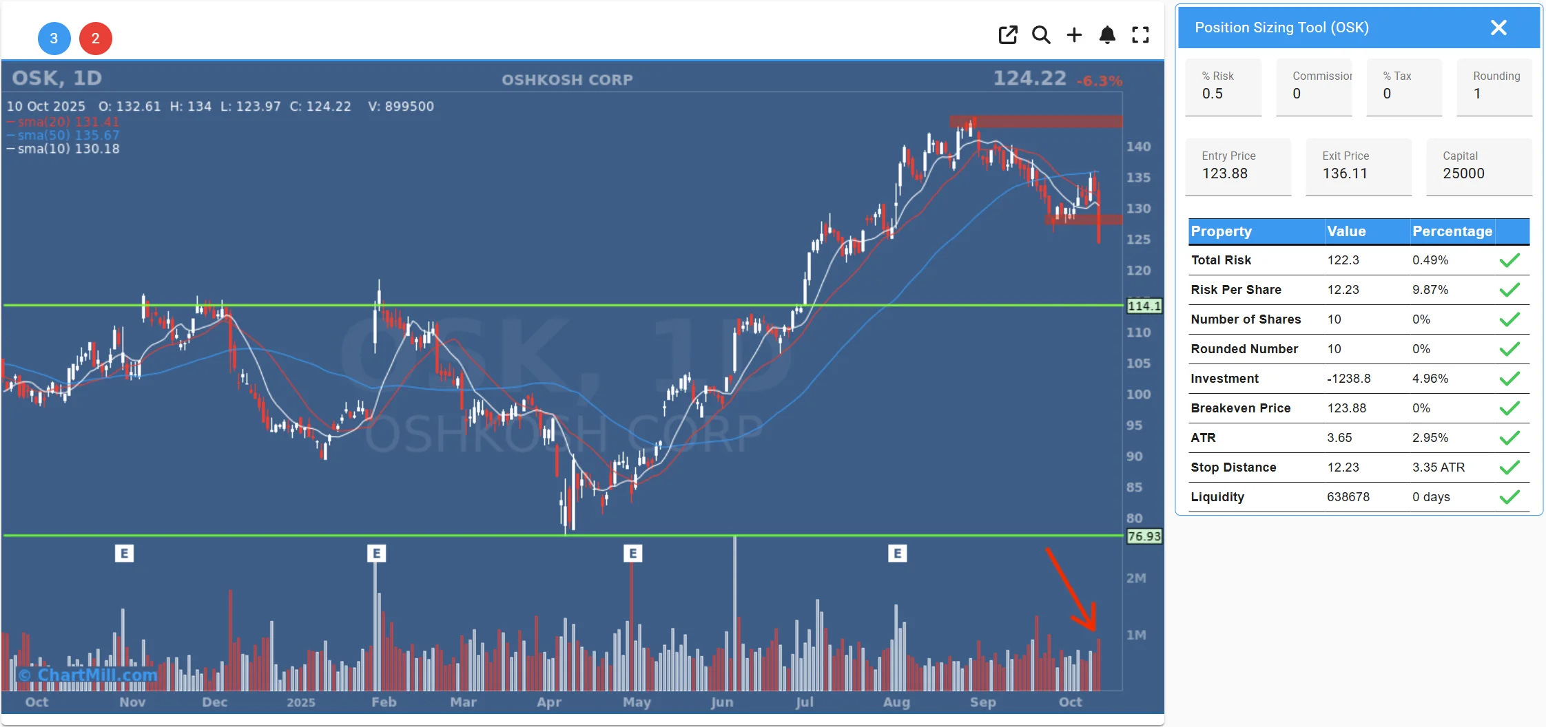 OSK recently broke below short-term support around $126 on increased volume, a clear sign of selling pressure. The stock had been consolidating near its highs but failed to regain momentum, and the breakdown triggered a shift in short-term trend direction.