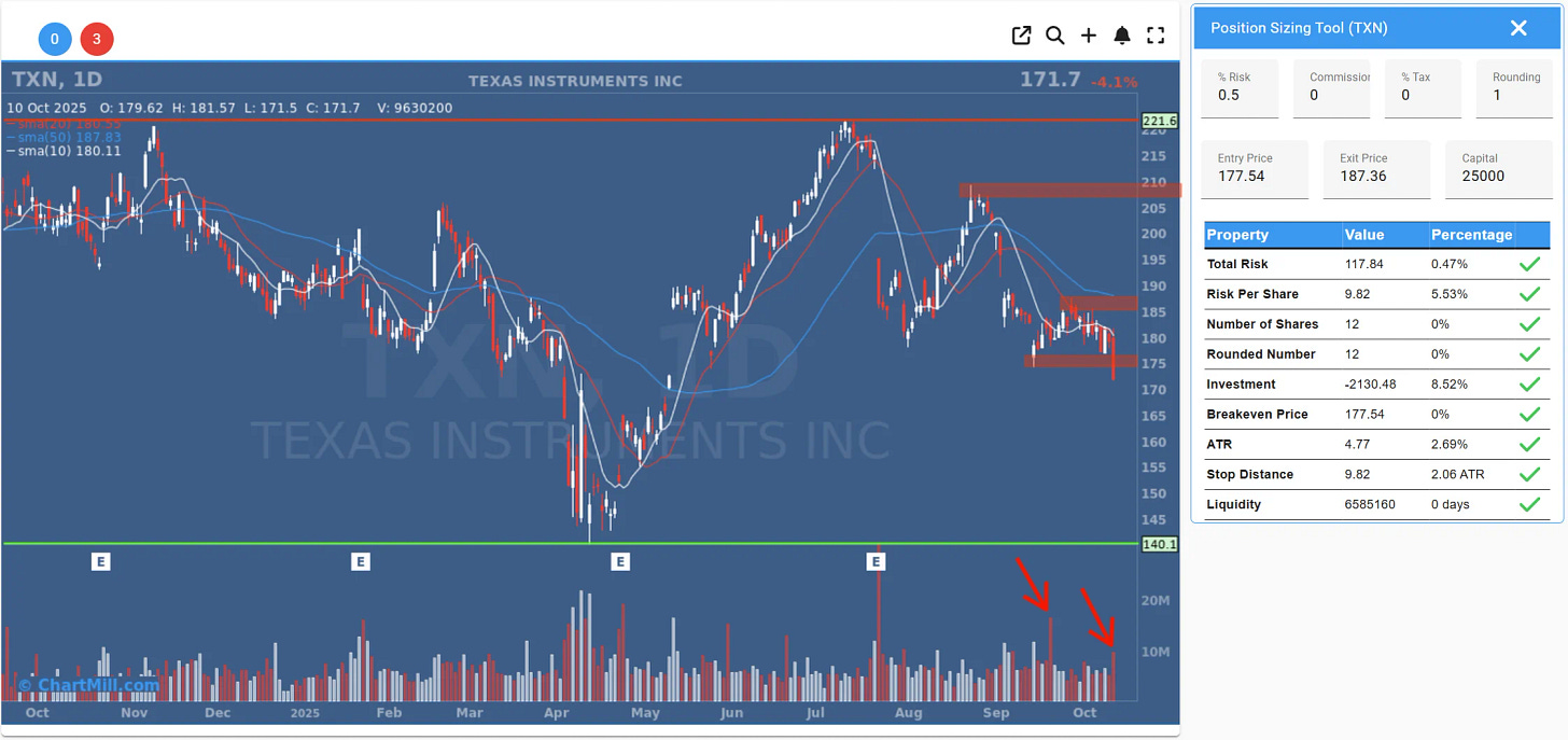 TXN has been forming a series of lower highs and lower lows since July. Last week’s bearish candle, accompanied by strong volume, confirmed the weakness and the failure of buyers to defend the $180 area.